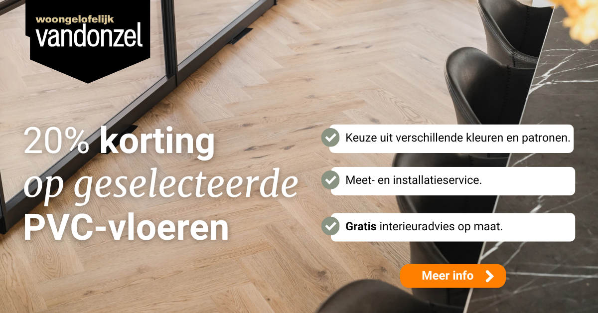Profiteer nu van 20% korting op geselecteerde PVC-vloeren bij Woongelofelijk Van Donzel.