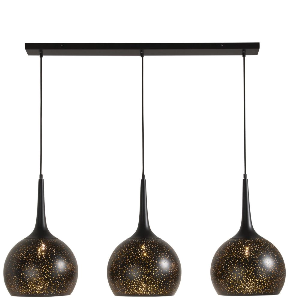Dankzij de gaatjes in het metaal zorgt deze bijzondere hanglamp ARJEN van COCOmaison voor een mooi lichteffect tegen de muur en het plafond. ARJEN bestaat uit drie zwarte hanglampen welke bevestigd zijn aan een zwarte plafondplaat van 30 x 113 cm. Het licht is dimbaar waardoor je kunt spelen met sfeer en de lamp is verstelbaar in hoogte (max. 130 cm). Je shopt ARJEN exclusief lichtbron. Hij is er ook in een paar andere varianten, waaronder een tafellamp, een vloerlamp, en nog een aantal variaties op deze hanglamp.