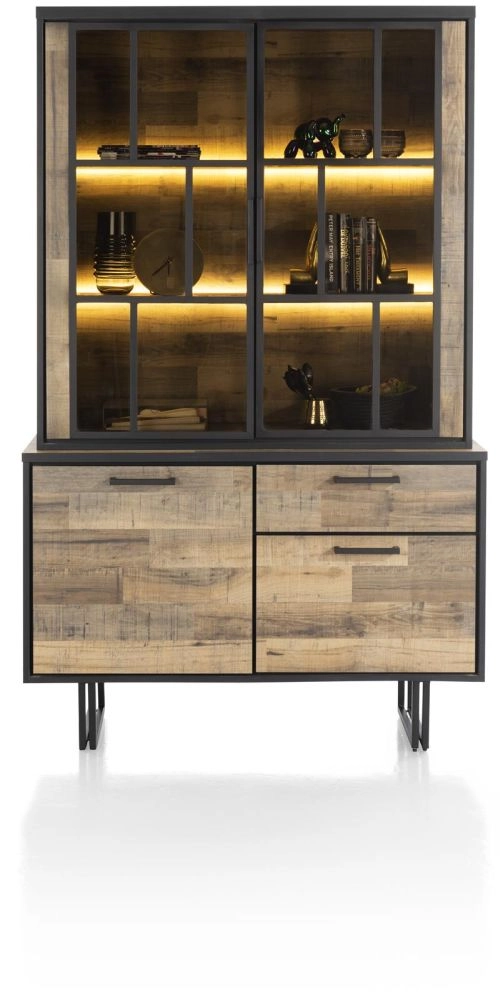 Deze gave buffetkast met industriële uitstraling is helemaal van nu. De buffetkast is afkomstig uit de Avalon-collectie en gemaakt van Primo Laminato. Primo Laminato is een onderhoudsvriendelijk materiaal met de uitstraling van massief hout. Deze versie van de buffetkast is afgwerkt in de stoere kleur driftwood. Dankzij deze kleur krijgt de kast een wat meer doorleefd uiterlijk. De metalen details versterken het industriële design. Achter de vitrinedeuren schijnt een warm ledlicht. Het onderstel van de kast heeft twee dichte deuren en een lade.
