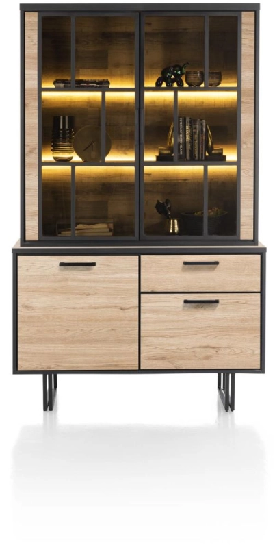 Een stoere buffetkast met een natuurlijke uitstraling. Deze buffetkast uit de Avalon-collectie is een aanrader voor de liefhebbers van meubels met karakter. Dankzij de strakke lijnen en metalen accenten heeft de bergkast een modern design. De kast is gemaakt van Primo Laminato, een sterk materiaal, met het uiterlijk van massief hout. Dankzij de afwerking in de kleur natural heeft de kast een warme, natuurlijke uitstraling. Sfeervol is het warme ledlicht achter de vitrinedeuren. De bergruimte in het onderstel van de kast is eveneens praktisch.