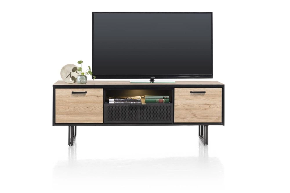 Dit moderne lowboard heeft de fraaie natuurlijke uitstraling van massief hout, maar is gemaakt van Primo Laminato. Dit is een sterk materiaal dat een betere vochtbestendigheid heeft dan hout en eenvoudig te onderhouden is. Het lowboard is afgewerkt in de kleur oak natural vintage en is voorzien van stoere zwarte metalen accenten. In het lowboard van 180 cm breed vind je 2 deuren, 1 lade en 1 extra vak voorzien van ledverlichting. Een fijn meubel voor je tv en multimedia-apparatuur.