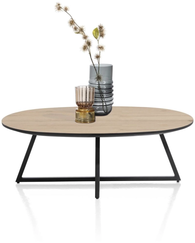 De moderne ovale salontafel uit de Avalon-collectie is in verschillende kleuren verkrijgbaar. Deze variant heeft een blad van Primo Laminato in de kleur oak natural vintage. De natuurlijke uitstraling van het blad vormt een mooi contrast met het zwart metaal van het onderstel van de tafel. Je kunt voor het tafelblad kiezen uit vier verschillende kleuren: natural, driftwood, roest en antraciet.