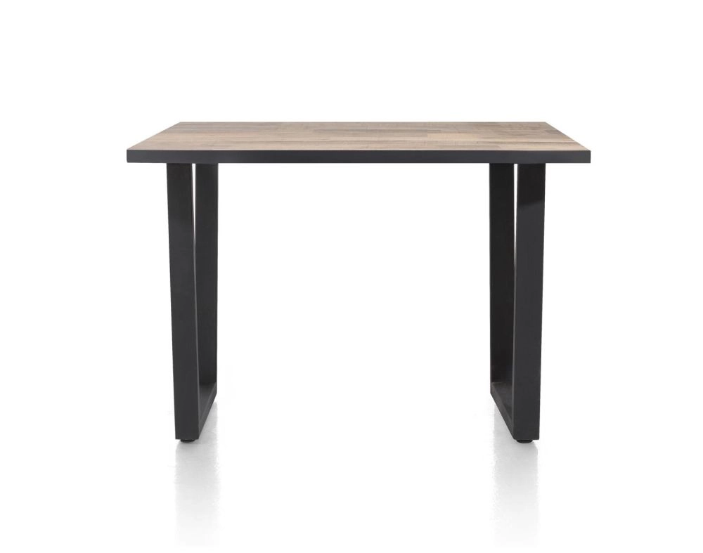 Deze moderne bartafel uit de Avalox-collectie is ideaal voor een gezellige maaltijd. Het tafelblad is vervaardigd uit Primo Laminato, een duurzaam en onderhoudsvriendelijk materiaal dat de uitstraling van echt hout heeft, en is verkrijgbaar in twee warme tinten: driftwood (afgebeeld) en oak natural vintage. Het onderstel is van zwart metaal, met drie opties om uit te kiezen: stoere V-poten (zoals hier), vier rechte poten voor een strakke uitstraling, of een centrale poot (zoals op de foto) voor een subtiele, moderne touch. De bartafel is verkrijgbaar in vier formaten, en deze uitvoering heeft een afmeting van 170 x 98 cm.