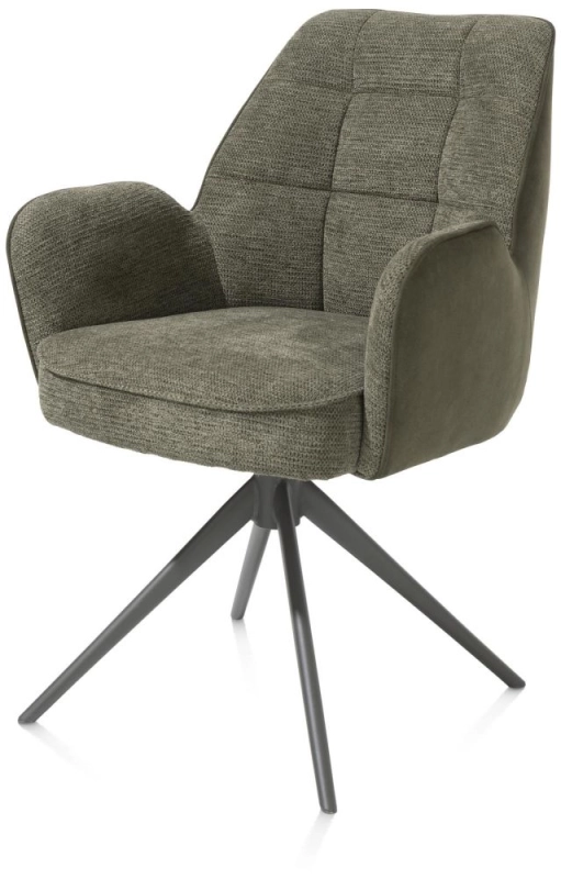Deze armstoel Bell heeft een uniek design met ruitvormige inpullingen in de rug en een speciaal zitcomfort met pocketvering. Het fijne frame heeft een grafietkleur en is bovendien draaibaar. De achterkant van deze stoelenserie is bekleed in de microvezelstof Calabria, de voorkant in stof Vada. Er is echter ook een versie die enkel in stof Calabria is uitgevoerd. De stoel is verkrijgbaar in 3 verschillende kleuren - kiezel, mosgroen en olijfkleurig. Dit is de uitvoering in mosgroen. Ben je eerder fan van een gewone eetkamerstoel? Die vind je ook in deze collectie!