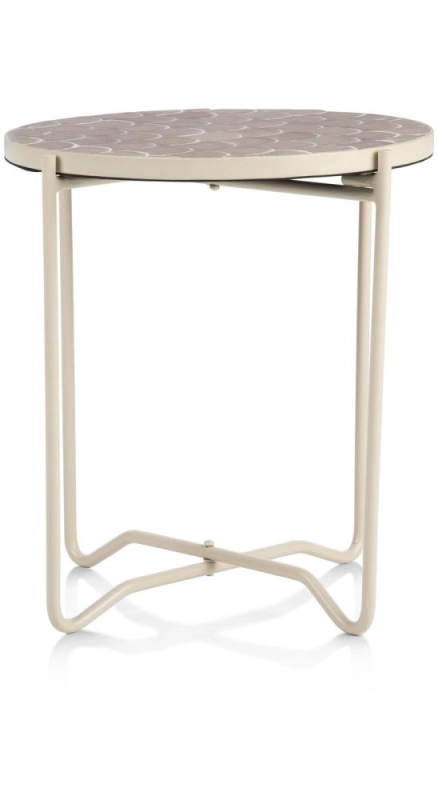 Haal de glamour in huis met de Bento bijzettafel van COCOmaison! Met een diameter van 43 cm en een hoogte van 45 cm is dit ronde tafeltje een kunstwerk op zich, met keramieken tegeltjes in schubbenpatroon in het roze. Het metalen frame met beige finish voegt een luxe toe. Dit veelzijdige meubelstuk kan dienen als bijzettafel, gecombineerd met een poef, of zelfs als trendy plantenstandaard of salontafel. Voeg een vleugje elegantie toe aan elke hoek van je huis met de Bento bijzettafel! Dit tafeltje is ook verkrijgbaar met een zwart/gouden blad.