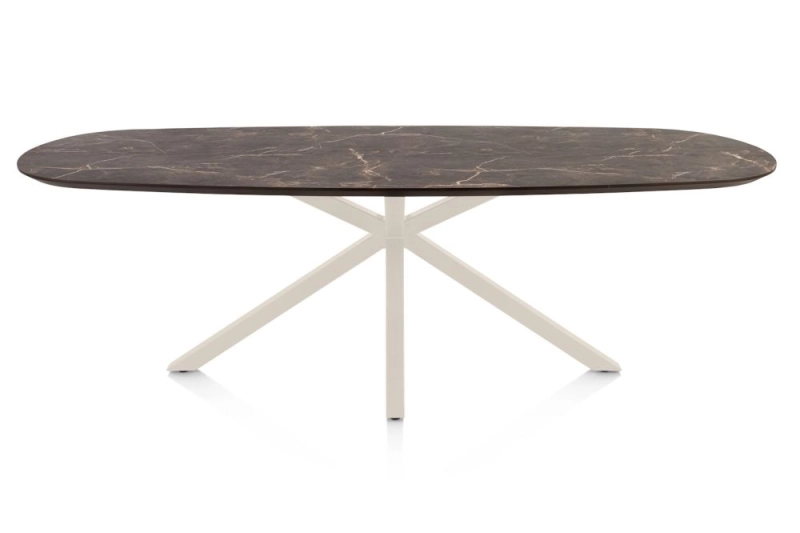 Caletta, eetkamertafel ovaal 240 x 105 cm. - HPL Primo Laminato blad - centrale kruispoot crème - marble brown