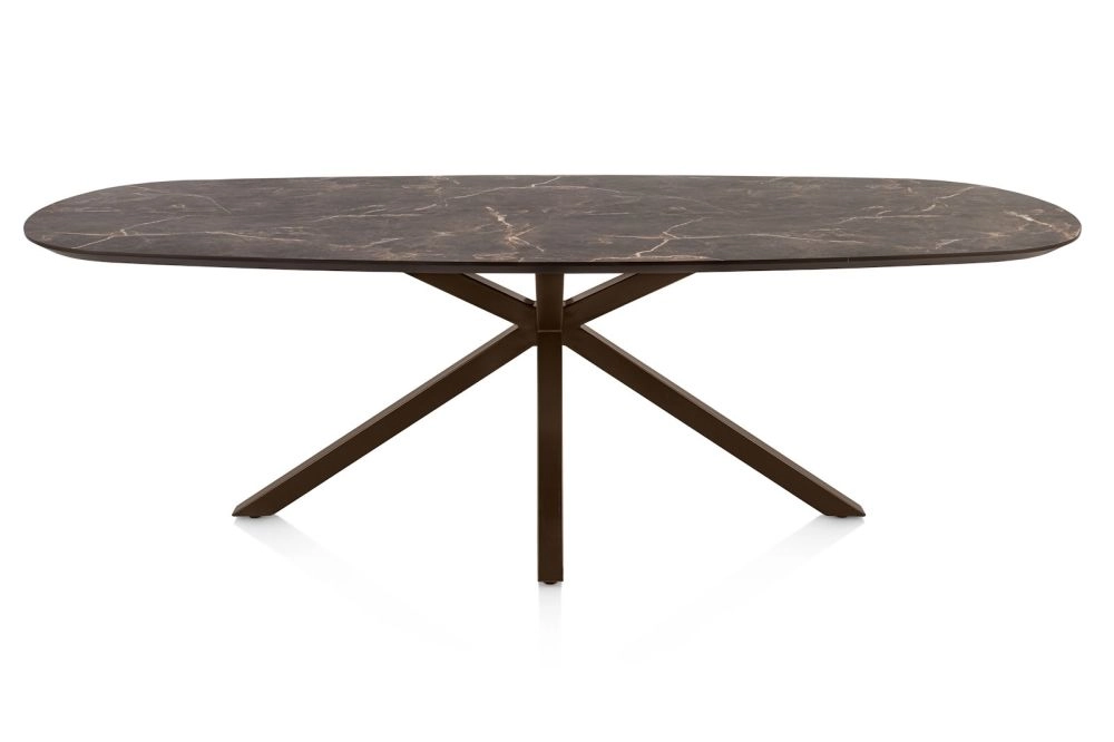 Caletta, eetkamertafel ovaal 240 x 105 cm. - HPL Primo Laminato blad - centrale kruispoot steelbrown - marble brown