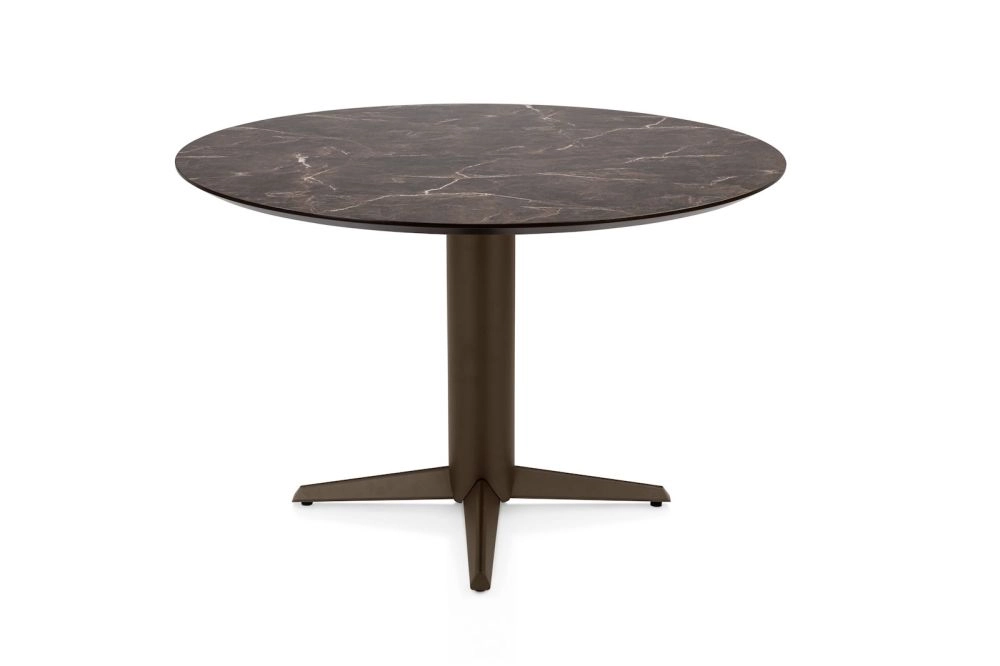 Caletta, eetkamertafel rond 120 cm. - HPL Primo Laminato blad - centrale teenpoot steelbrown - marble brown
