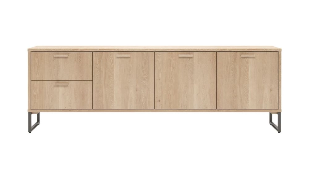De Castello-collectie straalt Scandinavische eenvoud uit, dankzij het gebruik van licht eikenhout in de kleur sand oak. Dit dressoir is 240 cm breed en 90 cm hoog.De drie deuren en twee laden zijn voorzien van houten grepen en het dressoir staat op stevige metalen poten in grafietkleur. Bovendien zijn alle deuren uitgerust met een softclose-systeem voor een geruisloze sluiting.