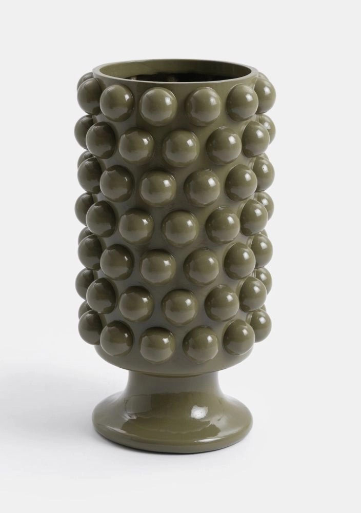 Laat bloemen nóg meer spreken met deze opvallende DOTS vaas. De combinatie van zachte rondingen, speelse dot structuren en een hoogglans afwerking geeft de vaas een artistiek karakter dat meteen opvalt. Met een hoogte van 41 cm, is dit item ideaal als statement piece op een dressoir, bijzettafel of vensterbank. De rijke olijfgroene tint geeft warmte en diepte aan je interieur en laat zich eenvoudig combineren met natuurlijke kleuren en moderne materialen. Deze vaas maakt deel uit van de DOTS collectie van COCOmaison, ontwikkeld in samenwerking met Trend Studio Francq Colors en is ook beschikbaar in de kleuren bordeaux en geel. Alle items binnen deze collectie zijn perfect met elkaar te mixen en matchen voor stijlvol en samenhangend geheel.