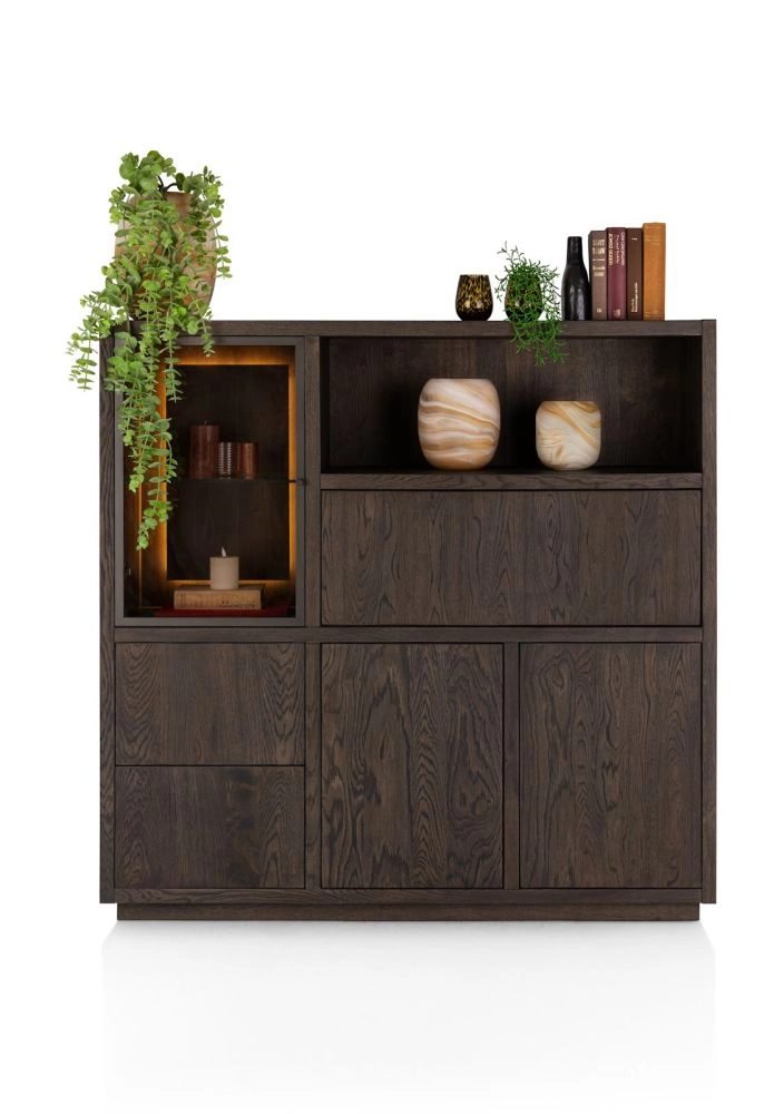 Het highboard uit de Gijon collectie combineert opbergen en presenteren in één stijlvol meubel. Het moderne design met strakke lijnen en plint zorgt voor een rustige uitstraling, terwijl het eikenfineer in diepe basaltkleur warmte toevoegt aan je interieur. Achter de deuren en in de lades berg je eenvoudig je spullen op, terwijl de glasdeur en niche ruimte bieden voor je mooiste items. De geïntegreerde ledverlichting zet deze subtiel in het licht en dankzij het soft-close-systeem sluit alles zacht en geruisloos.