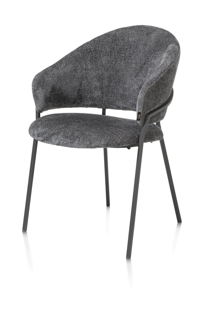 Armstoel Leyla heeft een uniek open design met een zeer fijn 4-pootsframe dat deels doorloopt in de rug. Dit zorgt voor een moderne touch. Ook de mooie platweefselstof met lichte glans Vulcano draagt bij aan deze moderne look. De rugleuning loopt helemaal door aan de zijkanten, wat zorgt voor de unieke armleuningen. Deze armleuningen zijn 66cm hoog en de zithoogte van deze stoel is 50cm. De stoel is verkrijgbaar in 4 kleuren: okergeel, groen, crème en antraciet. Hier zien we de antraciete versie afgebeeld.