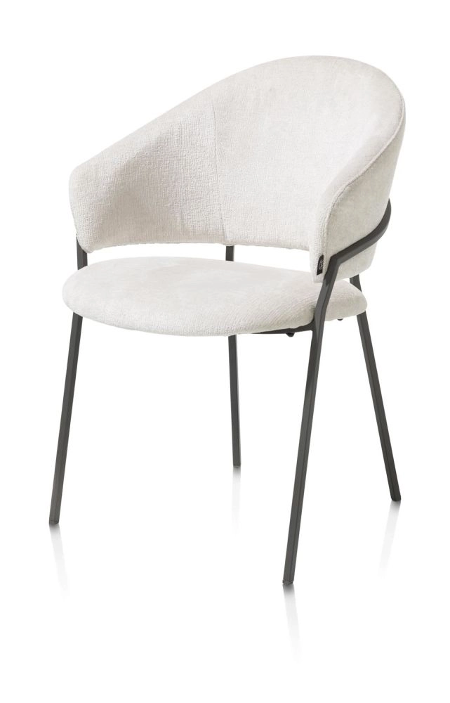 Armstoel Leyla heeft een uniek open design met een zeer fijn 4-pootsframe dat deels doorloopt in de rug. Dit zorgt voor een moderne touch. Ook de mooie platweefselstof met lichte glans Vulcano draagt bij aan deze moderne look. De rugleuning loopt helemaal door aan de zijkanten, wat zorgt voor de unieke armleuningen. Deze armleuningen zijn 66cm hoog en de zithoogte van deze stoel is 50cm. De stoel is verkrijgbaar in 4 kleuren: okergeel, groen, crème en antraciet. Hier zien we de versie in crème afgebeeld.