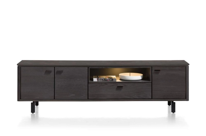 Heb je een grote tv en ben je op zoek naar een royaal tv-meubel? Dan is dit lowboard uit de Livada collectie een aanrader. Het lowboard is 210 cm breed, heeft 3 deuren, 1 klep en 1 niche. Opvallend is de kleur van het meubel: Onyx. Het lowboard is gemaakt van wildeikenfineer en heeft een strakke moderne uitstraling, die door de opvallende kleur alleen maar wordt versterkt. Een fraaie blikvanger.