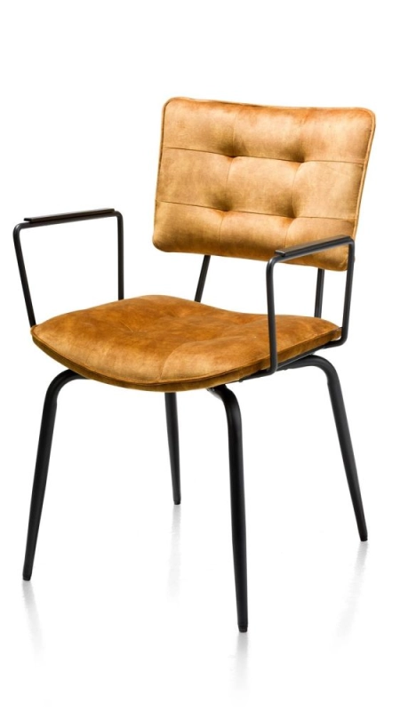 Armstoel Manou heeft een modern design met een luxe uitstraling. Het frame van de stoel is gemaakt van metaal in de kleur off black. De armstoel is bekleed met de microvezelstof Karese, met een velvet look en is zacht en sterk tegelijk. Door de rugleuning en zitting te capitonneren, oogt de stoel erg sjiek. De kleur van de bekleding is oker.