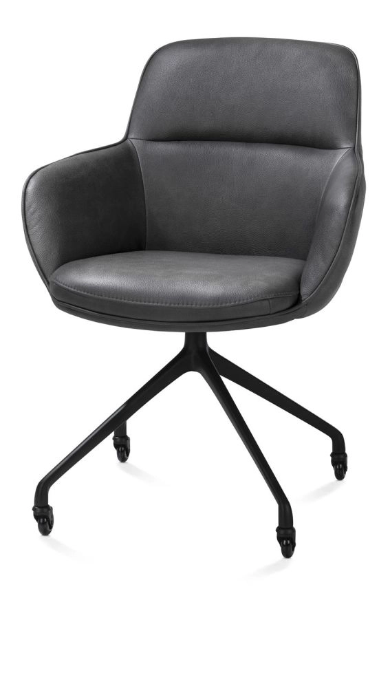 Met de stoel Mateo kies je voor comfort en design. In de versie met armleuningen en bekleed in Pala‑stof (lichtgrijs of antraciet) staat hij stijlvol in zowel modern als klassiek decor. De zachte bekleding en fijne stiksels geven een rijke uitstraling. Voor extra gemak is er keuze uit wieltjes of draaibaar onderstel; wie liever een vaste zit wil, gaat voor vier pootjes. Het onderstel is beschikbaar in Graphiet, Rough off black of Steelbrown – perfect passend bij je interieur. Dankzij de ergonomische rug en zitting blijft zitten aangenaam.