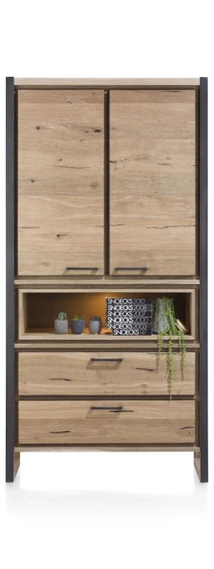 Deze moderne en stoere bergkast uit de Metalo collectie van Henders & Hazel biedt voldoende bergruimte dankzij de 2 deuren en 2 laden. De niche is ideaal om leuke woondecoraties in uit te stallen. Handig en sfeervol is de geïntegreerde led-verlichting. Opvallend aan deze stoere kast is de combinate van metaal en eikenhoutfineer. De metalen profielen rondom de deuren en laden zorgen voor een moderne finishing touch.