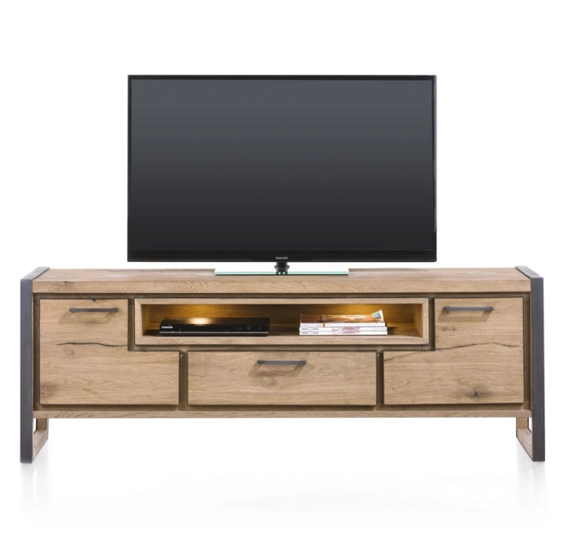 Dit moderne lowboard Metalo van Henders & Hazel heeft een stoere uitstraling dankzij de combinatie van eikenhoutfineer en metaal. Opvallend zijn de poten van deze lage kast die doorlopen. Handig is de geïntegreerde led-verlichting. De metaal profielen rondom de deurtjes en laden zorgen voor de finishing touch van dit eigentijdse meubel. Het lowboard heeft 2 deuren, 1 lade en 1 niche. Een aanwinst voor het eigentijdse interieur! Het lowboard in deze uitvoering is in een 210 cm en 170 cm lange uitvoering verkrijgbaar.