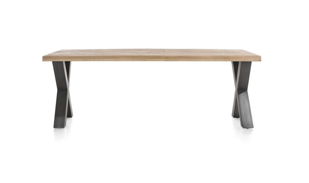 Strak, stoer en robuust. Deze tafel uit de Metaloxcollectie van Henders & Hazel is 230 x 100 cm en heeft een modern design. Het strakke houten tafelblad combineert super met de metalen tafelpoten in X-vorm. Een praktische eyecatcher.