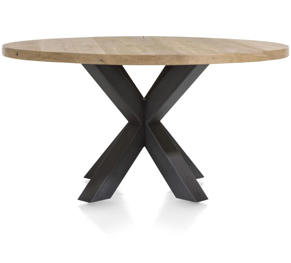 De ronde eetkamertafel wordt weer steeds vaker gezien in het interieur. Deze stoere eetkamertafel met rond blad is afkomstig uit de Metalox-collectie. Het tafelblad van massief eiken heeft een diameter van 150 cm. Opvallend is de zwart metalen centrale kruispoot onder de tafel. Deze geeft de eetkamertafel een stoer en modern design. De ronde eetkamertafel is in twee verschillende maten verkrijgbaar, 130 cm en 150 cm.