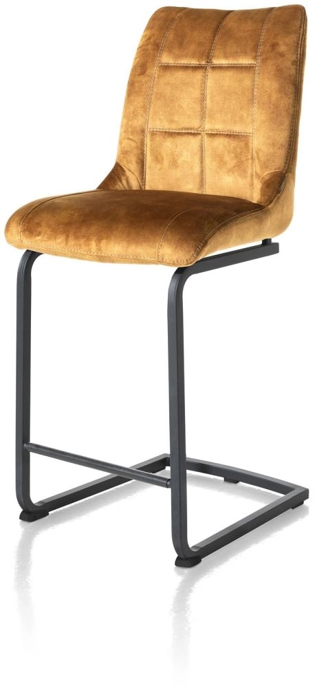 Deze variant van barstoel Mischa heeft een vierkant, zwart metalen swingframe. De barstoel is bekleed met de velvetachtige stof Karese in de kleur oker. Karese is een zachte, warme en onderhoudsvriendelijke stofsoort. Met behulp van de handgreep op de rugleuning van de barstoel, is deze makkelijk te verplaatsen. Er zijn verschillende varianten van Mischa verkrijgbaar.