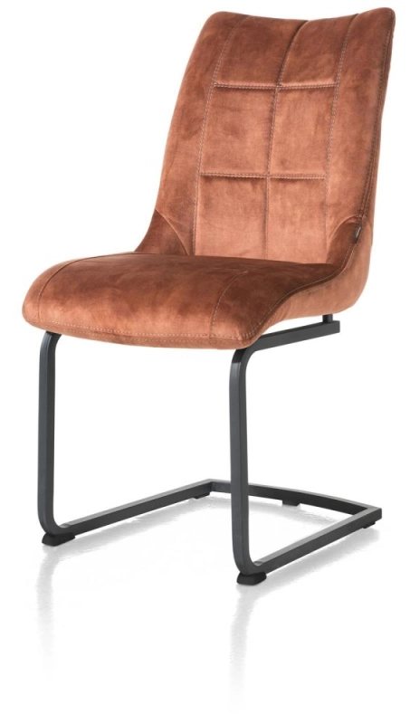 Eetkamerstoel Mischa bestaat uit een heerlijk comfortabele kuip die rust op een vierkant, zwart metalen swingframe. De stoel is bekleed met de stof Karese in de kleur koper. Een onderhoudsvriendelijke stof met een warme velvetachtige uitstraling. Mischa is in verschillende kleuren en uitvoeringen leverbaar. De stoelen zijn onderling goed met elkaar te combineren.