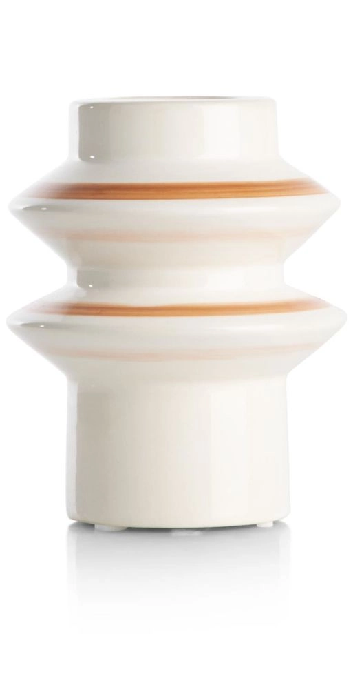 Oranje is terug in het interieur, maar veel subtieler dan in de jaren '70. De oogverblindende compleet oranje muren en meubels hebben plaatsgemaakt voor zachte kleuraccenten. De NORA serie van COCOmaison is hiervan een goed voorbeeld. De kandelaar heeft een hoogte van 15 cm, is crème-kleurig en versierd met handgeschilderde oranje ringen. Hij heeft een vriendelijke vorm en staat leuk op elke tafel of kast. En wat helemaal leuk is: er past zowel een dinerkaars als een stompkaars in. Wanneer je dan ook nog af en toe kiest voor een andere kleur kaars, ziet je kandelaar er telkens weer anders uit.