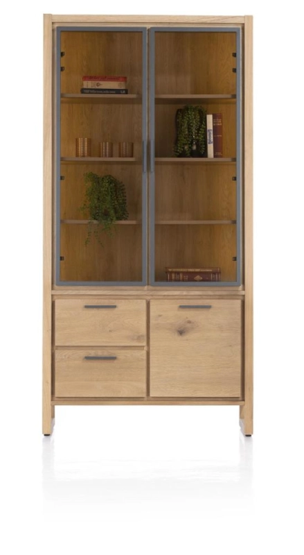 Droom je van een vitrinekast met een natuurlijke look en strakke lijnen? Laat je verrassen door NYSTEAD, een moderne vitrinekast met een landelijke uitstraling. Hij is uitgerust met 2 glasdeuren, 1 deur en 2 laden met soft-closing systeem. De ledverlichting in de vitrine zorgt voor extra allure en zet jouw mooiste items in de schijnwerpers. NYSTEAD heeft metalen grepen en is gemaakt van hoogwaardig eikenfineer in de kleur dune natural. Dit straalt warmte en een natuurlijke sfeer uit. De platinumlak geeft jouw vitrinekast een matte, luxe uitstraling en sterke bescherming. NYSTEAD komt prachtig tot zijn recht in combinatie met de tafels uit de NYBORG collectie.