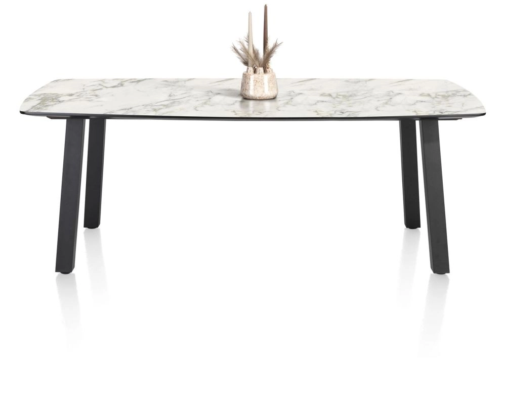 De tafels uit collectie Palace zijn verkrijgbaar in heel wat verschillende formaten, in 5 verschillende kleuren en met 2 verschillende onderstellen. In totaal zijn er zo wel 100 verschillende tafelcombinaties mogelijk! Deze tafel heeft een onderstel met 4 poten, heeft een tafelblad van 240x115cm en is uitgevoerd in een marmerlook in de kleur wit. Het tafelblad is gemaakt van Primo Laminato (HPL), een uiterst onderhoudsvriendelijk materiaal en het onderstel is van zwart metaal. Is deze tafel toch niet wat je zoekt? Er zijn nog heel wat andere kleuren en formaten verkrijgbaar!