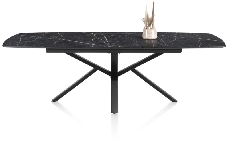 De tafels uit collectie Palace zijn verkrijgbaar in heel wat verschillende formaten, in 5 verschillende kleuren en met 2 verschillende onderstellen. In totaal zijn er zo wel 100 verschillende tafelcombinaties mogelijk! Deze uitschuiftafel heeft een centraal onderstel, heeft een tafelblad van 190x110cm, kan met 60cm verlengd worden tot 250cm en is uitgevoerd in een marmerlook in de kleur onyx. Het tafelblad is gemaakt van Primo Laminato (HPL), een uiterst onderhoudsvriendelijk materiaal en het onderstel is van zwart metaal. Is deze tafel toch niet wat je zoekt? Er zijn nog heel wat andere kleuren en formaten verkrijgbaar!
