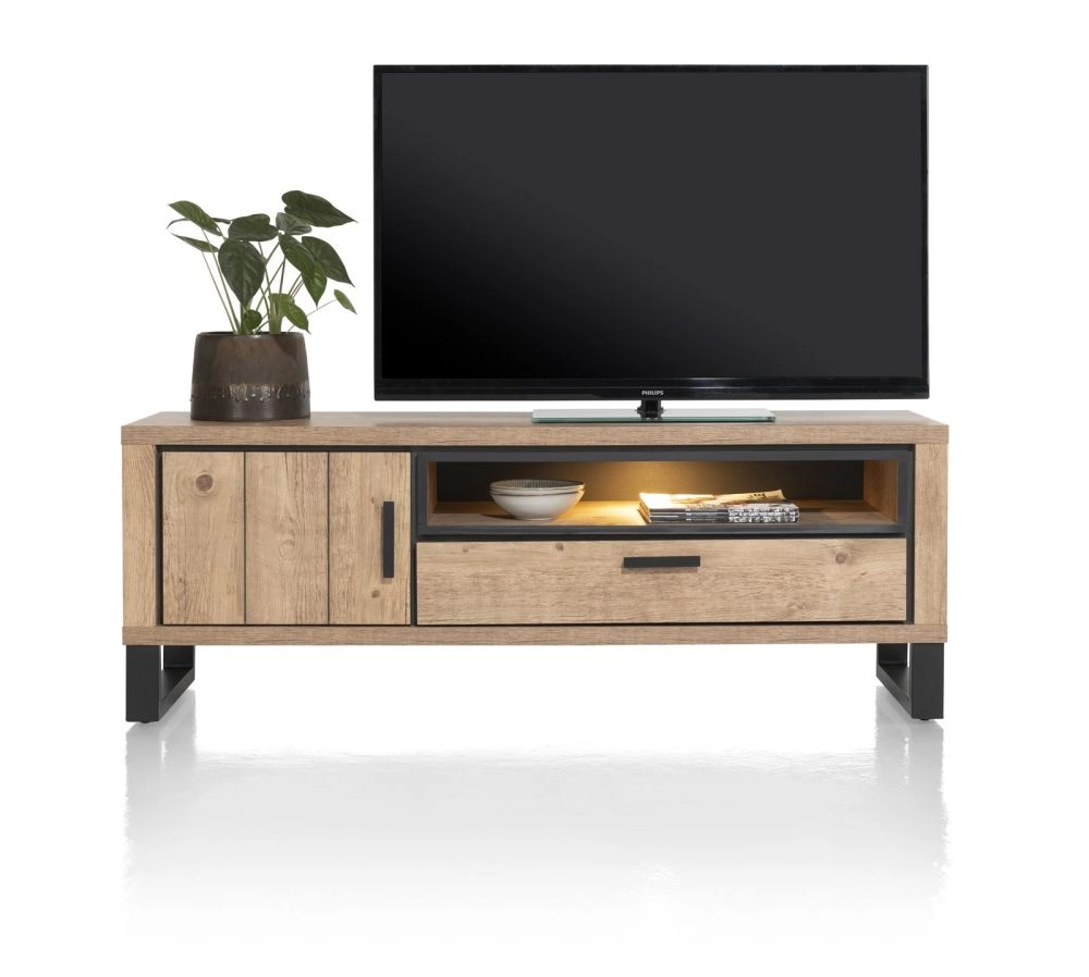 Dit lowboard komt uit collectie Pavarotti van Henders & Hazel en meet 150cm breed. Het lowboard is perfect geschikt als tv-meubel voor kleine ruimtes of laag bijzetmeubel in de woonkamer en heeft een deur, een lade en een open vak waar een tv-ontvanger in past. Het open vak wordt prachtig verlicht door subtiele ledverlichting. De accenten van deze collectie zijn in zwart metaal, de meubels zelf zijn gemaakt van Primo Laminato (HPL) en zijn daarom makkelijk te onderhouden.