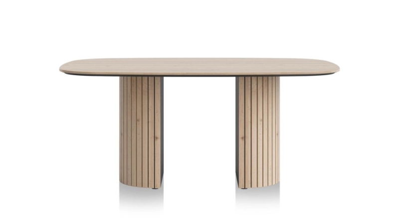 De tafels uit collectie Pavie van Henders & Hazel zijn er in verschillende formaten zoals de meeste van onze tafelcollecties. Net zoals de meubels worden ook de tafels gekenmerkt door een lattenstructuur. Wat deze tafels uniek maakt, is de cilindervormige kolompoot. Dit is een ovale tafel die wordt gekenmerkt door een cilinderpoot in twee delen en een tafelblad van 180x120cm. De tafel is verkrijgbaar in een lichte houtkleur en in het zwart. Dit is de Natural-versie, die mooi staat in natuurlijke interieurs.