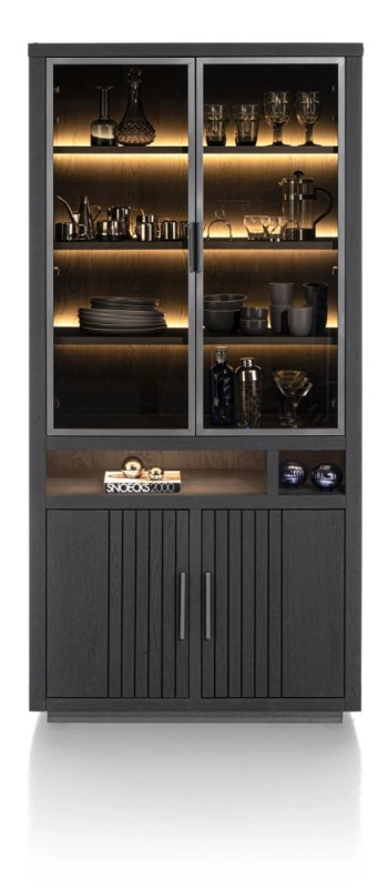 Deze vitrinekast uit collectie Pavie is uitgevoerd in het industriële castle black, maar is ook beschikbaar in een natuurlijke variant. Deze vitrinekast, die 100cm breed is, is verkrijgbaar met zwarte metalen poten (215cm hoog) en zonder (205cm hoog). De kast heeft bovenaan twee grote glasdeuren, in het midden een groot en klein open vak en onderaan twee ruime kastdeuren met latten, die opvallend veel opbergruimte bieden.