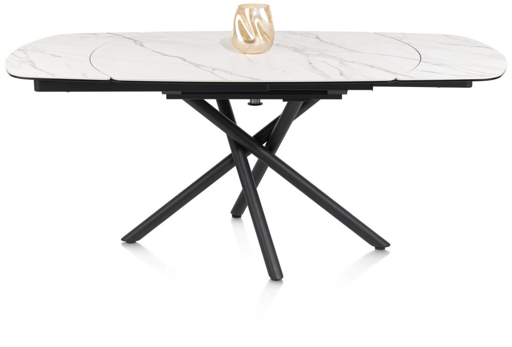 Wil je een eettafel die niet teveel plaats inneemt, maar waaraan je wel al je vrienden kunt uitnodigen? Dan is de Preston uitschuiftafel precies wat je zoekt. Hij heeft een basisformaat van 120x90cm en fraaie afgeronde hoeken. Met een super handig draaimechanisme vergroot je deze compacte tafel echter tot een ruime tafel van 180 cm wanneer je maar wilt! De centrale poot zorgt ervoor dat je aan alle kanten prettig kunt zitten en het oersterke keramiek op glas blad maakt de tafel uitermate 'feestbestendig'. Deze uitvoering heeft een witte marmerlook, maar, maar hij is er ook met een antraciet blad.