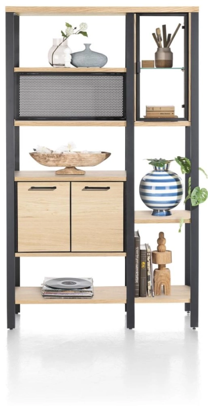 Op zoek naar een multifunctionele roomdivider? Met heel wat open vaken, gesloten kastdeuren en zelfs glazen deuren kun je met dit meubel alles: opbergen, pronken met decoratie en vooral opvallen! De roomdivider plaats je midden in de ruimte, want de kastdeuren en glazen deuren kun je langs beide kanten openen. Lekker handig toch? Deze versie van de roomdivider is uitgevoerd in eikenfineer in de een natuurlijke eikenkleur en categoriseren we onder de moderne woonstijl. Het meubel is 120 cm breed, wat best groot is voor een roomdivider!