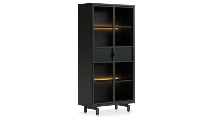 Deze vitrinekast uit de collectie Ridgefield Dark heeft een strak design en wordt binnenin prachtig verlicht door strips met ledverlichting achter de legplanken. Naast mooie glazen kastdeuren vind je in het midden binnenin ook nog twee lades voor extra opbergruimte. Een eyecatcher van formaat, deze royale kast twee meter hoog! Ook verkrijgbaar in een Natural versie met een natuurlijke eikenkleur.