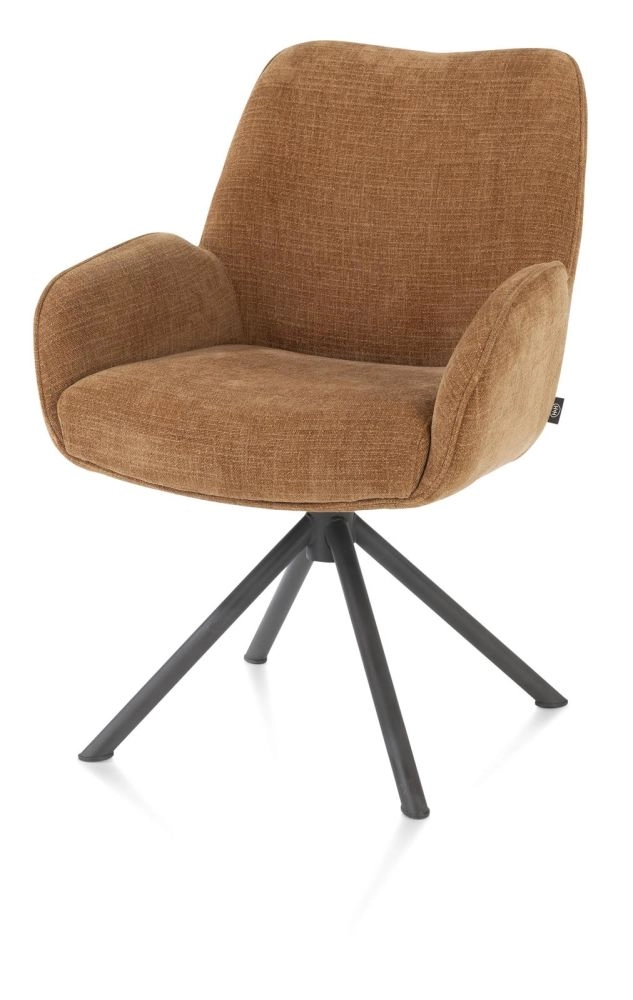 RILEY is een heerlijk comfortabele armstoel met prachtige ronde vormen. Hij is uitgerust met een relaxsysteem en pocketvering in de zit. Armstoel RILEY is 360 graden draaibaar en voorzien van terugdraaifunctie. Hij is bekleed met stof Cadiz in de kleur koper. Kijk ook eens naar de andere kleuren waarin RILEY verkrijgbaar is en ga voor een speelse mix aan je eettafel! De armstoel heeft een frame in de kleur grafiet dat ook verkrijgbaar is in naturel eiken.