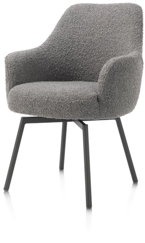 Deze draaibare armstoel Rocco heeft een lekker brede kuip en heeft 4 poten in de kleur grafiet. Daarnaast heb je ook de keuze uit een frame met lichte eikenhouten poten. De stoel is eveneens verkrijgbaar als draaibare eetkamerstoel zonder armleuningen. De zithoogte van deze stoel is 50cm en de stoel is uitgevoerd in de trendy lusjesstof (bouclé) Brioni. De stoel is verkrijgbaar in twee kleuren. Hier zien we de versie in de kleur lever.