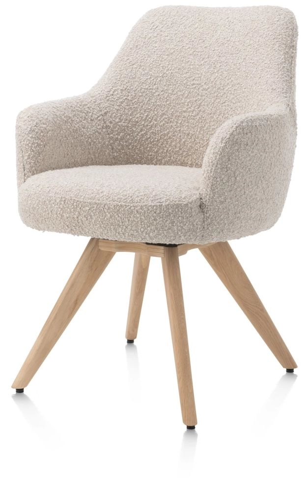 Deze draaibare armstoel Rocco heeft een lekker brede kuip en heeft 4 natuurlijke eikenhouten poten. Daarnaast heb je ook de keuze uit een 4 poten in de kleur grafiet. De stoel is eveneens verkrijgbaar als draaibare eetkamerstoel zonder armleuningen. De zithoogte van deze stoel is 50cm en de stoel is uitgevoerd in de trendy lusjesstof (bouclé) Brioni. De stoel is verkrijgbaar in twee kleuren. Hier zien we de versie in de kleur crème.