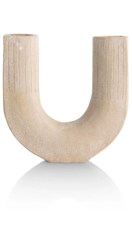 De boogvaas SUZE van COCOmaison heeft een bijzonder ontwerp. Het is een beige polyresin vaas van 16 cm met twee openingen waar je bloemen of takjes in kunt zetten. De beide uiteinden zijn versierd met dunne ingekerfde lijntjes, maar het totale design is prachtig puur en simpel. Zet hem solo op een kast of tafeltje of combineer hem met andere vazen in gelijke kleuren van verschillende vormen en hoogtes.