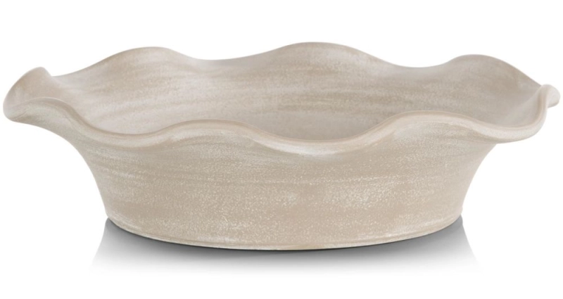 De oorsprong van de naam WAVE laat zich makkelijk raden: deze stijlvolle reeks potten en schalen kenmerkt zich door een verfijnde golfende rand. WAVE van COCOmaison wordt geproduceerd in Portugal, van 100% aardewerk. Elk object uit deze serie is met de hand gemaakt en er zijn dus geen twee stuks hetzelfde! De kleur is beige, maar ook in de kleurnuance is iedere pot uniek. De schaal is verkrijgbaar in drie maten, waarvan dit de grootste is. Deze schaal heeft een doorsnede van 45cm bij een hoogte van 11cm.