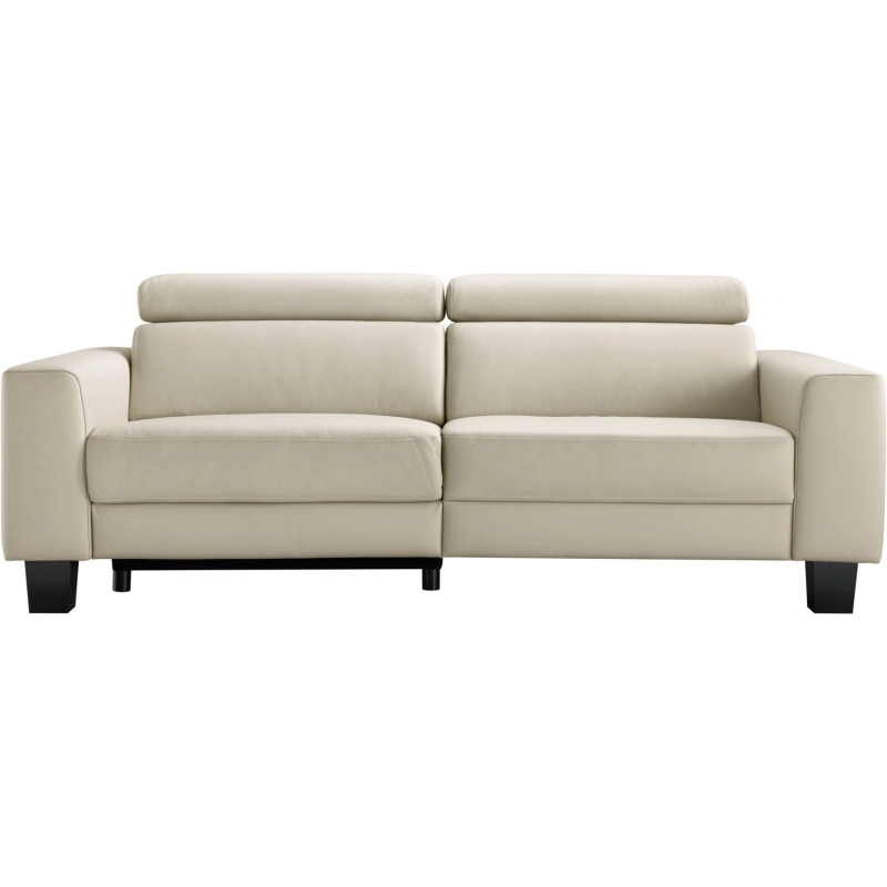 Uitgevoerd in leder toledo nebbia met arm type W, ondiepe zit (52 cm), bonellvering in de zitting, 2-motorige elektrische relaxfunctie (voorstaand links), verstelbare hoofdsteunen en zwarte houten poten type HF3 (14 cm).