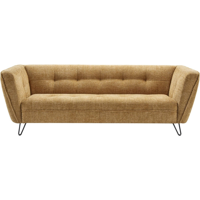 De 3-zitsbank Sontino okergeel van het merk INHOUSE is een prachtige aanvulling voor jouw woonkamer. Deze bank heeft een eigentijdse uitstraling met een warme, okergele kleur die een gezellige sfeer creëert. De fraaie belijning en het opvallende capiton stiksel op de rug en de zitting maken deze bank tot een echte blikvanger. Bovendien zijn de zwarte metalen V-vormige draadpoten een moderne touch die perfect aansluiten bij de eigentijdse stijl.