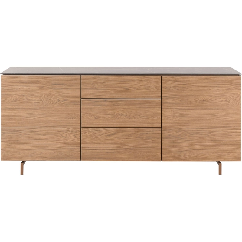Dressoir Stonara is onderdeel van een woonprogramma en heeft een strakke en moderne uitstraling. Door de ranke pootjes lijkt het dressoir te zweven. Het dressoir is gemaakt van onderhoudsvriendelijke Lamulux en heeft een warme houtstructuur. De bovenbladen zijn uitgevoerd in een stijlvol marmerdecor.