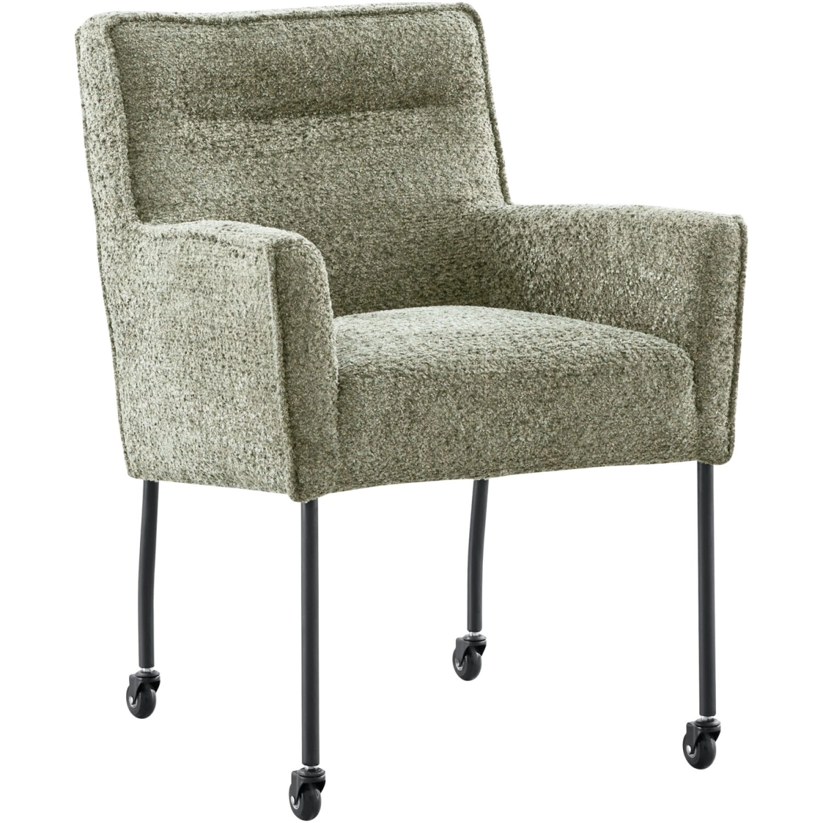 Model Caritas in kleur groen is voorzien van zwarte metalen poten met skatewielen en een armleuning wat de stoel een stoere uitstraling geeft. De stiknaad in de rugleuning geeft dit model een eigen karakter. Caritas beschikt over een stalen nosagvering gecombineerd met HR-schuim in de zitting om je een optimaal zitcomfort te bieden.