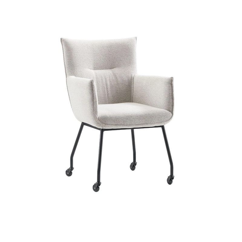 Deze uitvoering van de armstoel is bekleed in stof sneak, dit is een grove weefstof met een zachte touch. Daarnaast is de stoel voorzien van een zwart metalen frame met zwarte skatewielen. Geen gedoe meer met schuiven of optillen van zware stoelen. Je kunt gewoon plaatsnemen en met een zachte zwenkbeweging naar de gewenste positie rollen. Een geweldige optie voor gezellige diners of wanneer je gewoon even wilt ontspannen na een drukke dag.