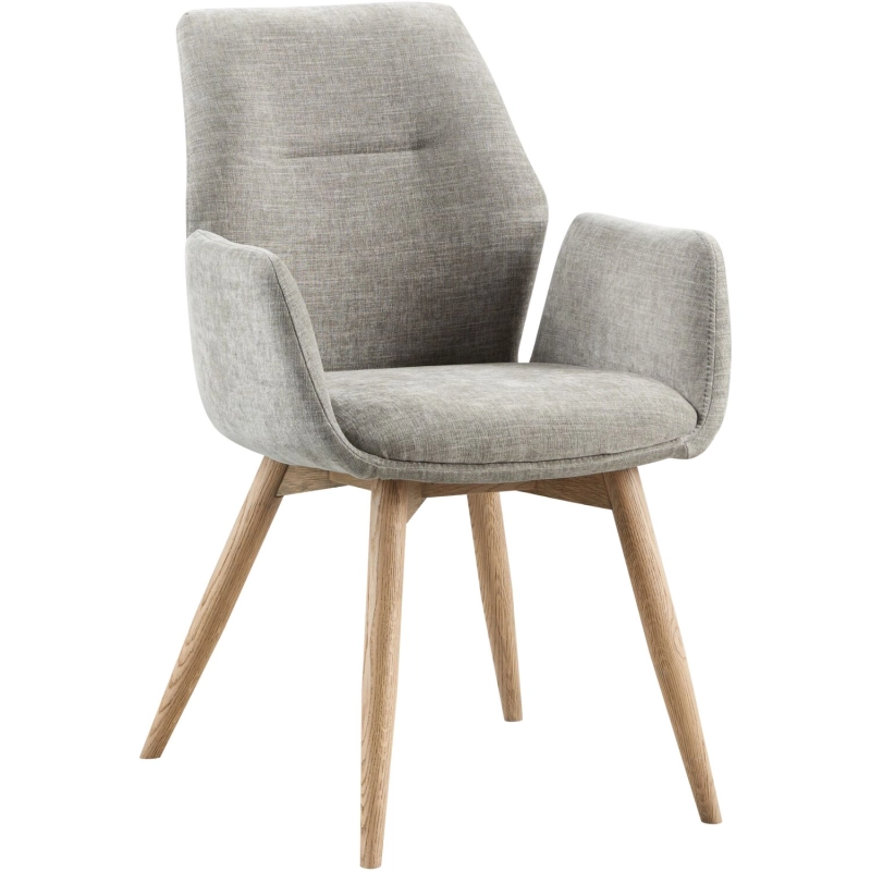 Armstoel Dayla kent vele mogelijkheden. Met zijn mooie vormen is dit model een echte eye-catcher voor aan je eettafel. Of je nu een stoel wenst met of zonder armleuning, met metalen of een eikenhouten onderstellen. Alles is mogelijk! Deze eetkamerstoel is uitgevoerd in een grijze stof met een mooi horizontaal stiksel op de rugleuning en 4 eikenhouten poten.