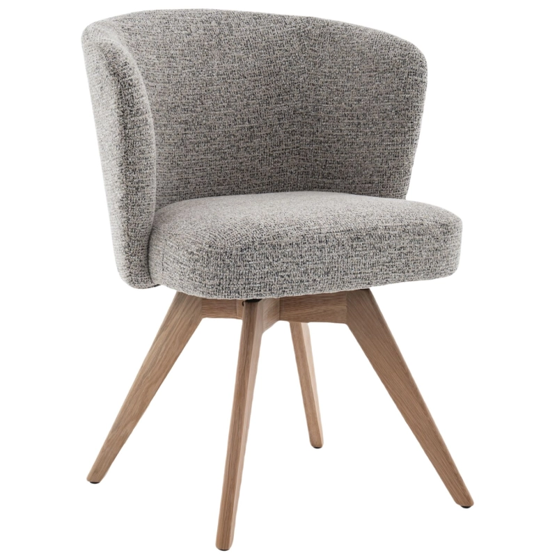 Armstoel Mandolia is met zijn trendy afgeronde vorm een echte eye-catcher voor aan je eettafel. Deze moderne eetkamerstoel is uitgevoerd in een mooie lichtbruine weefstof en een draaibaar massief eiken onderstel inclusief terugdraaimechanisme. Hierdoor zal de stoel altijd weer naar zijn oorspronkelijke positie terugdraaien.