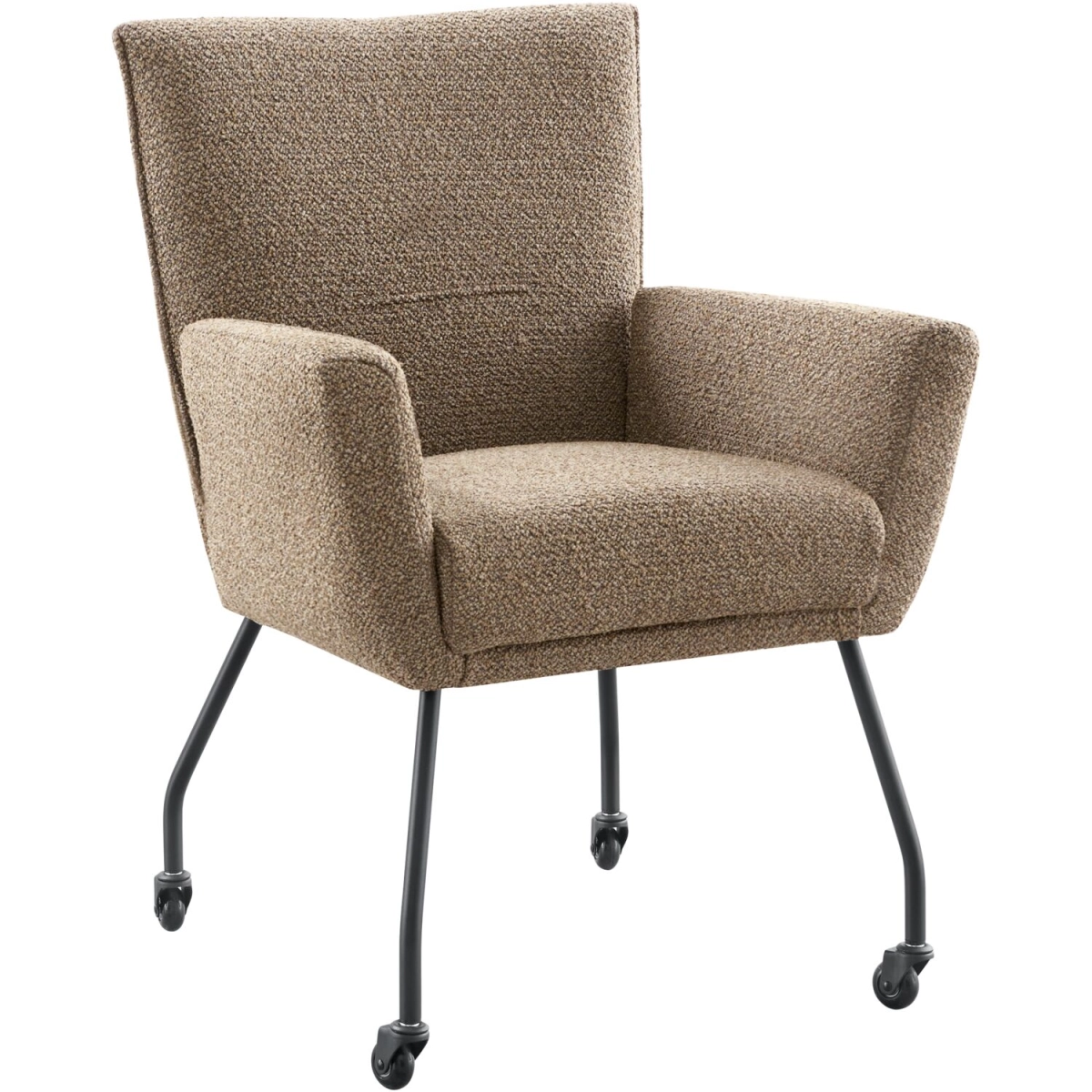 Eetkamerstoel Rantio XL heeft een stoere uitstraling door het gebruik van een mooie bruine stof, zwarte metalen poten met skatewielen en een trekstrook op de rugleuning. Deze eetkamerstoel met armleuning biedt een uitstekend zitcomfort en is erg geschikt voor een heerlijk avondje tafelen met vrienden of familie.