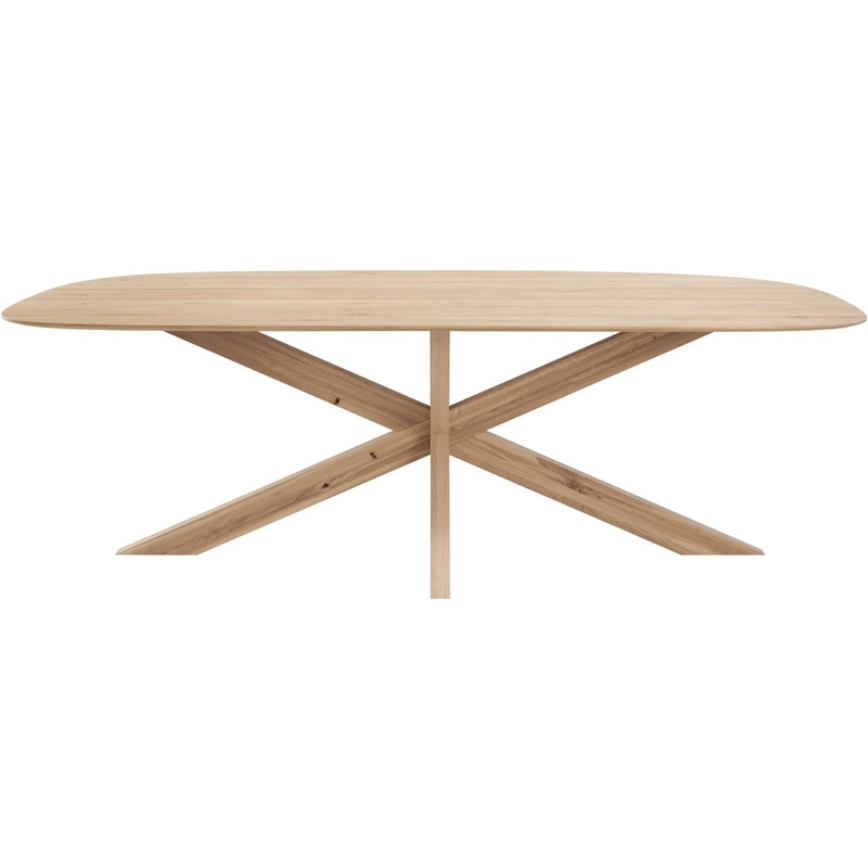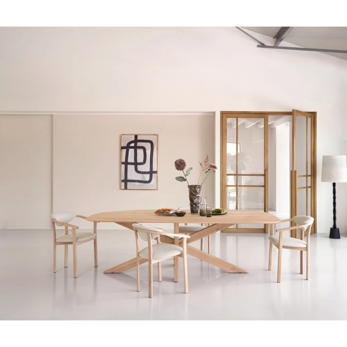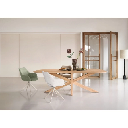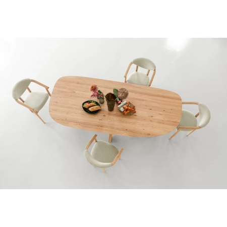 Geef je eethoek een stoere look met organische eettafel Selectio, uitgevoerd met een organisch blad en verjongde rand in eiken kleur basic E017, gecombineerd met een houten spinpoot.